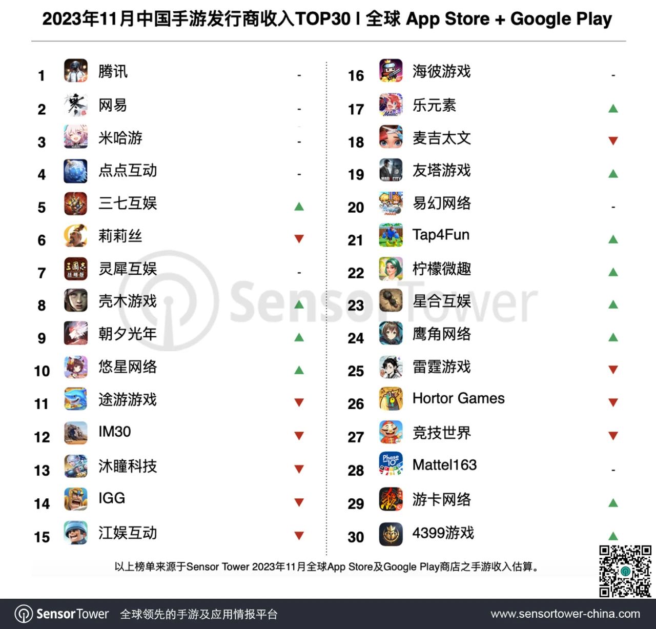 榜单之外,入围全球收入Top 100的我国手游发行商依次是心动网络、Goat Games、智明星通、益国际、游酷盛世、完美国际 和 雅乐科技 共37家厂商。